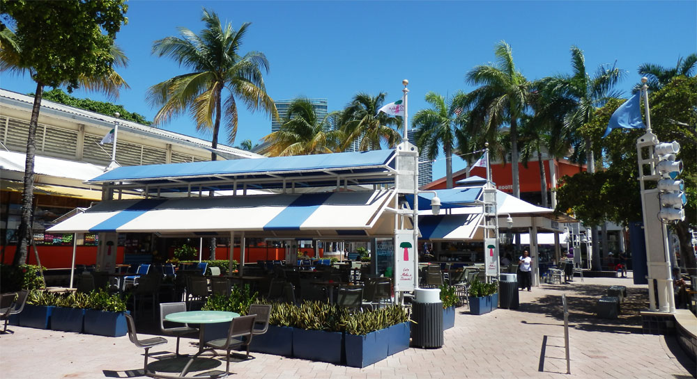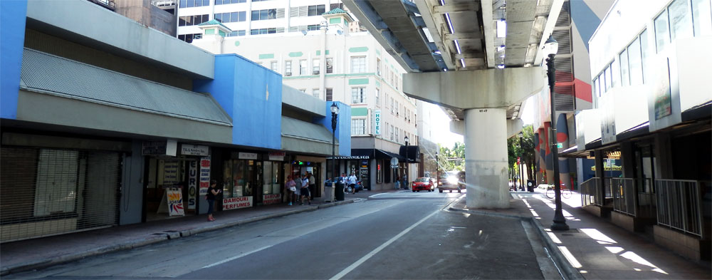 Dan komen we opeens in een netter gedeelte, het zakelijke gedeelte van Miami Downtown. De straat is een stuk schoner, maar de doelgroep ook anders. Je zal hier voornamelijk lunch tentjes vinden. Niet iets waar we op dit moment naar op zoek zijn.