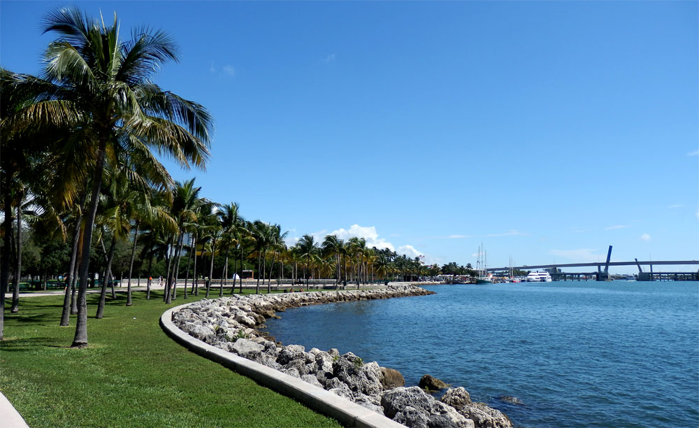 Eenmaal aangekomen in downtown Miami zetten we ons paard op een parkeerplaats en kopen een kaartje. We besluiten eerst richting Bayfront park te lopen, een park dat ligt aan het water (Biscayne Bay). Bayfront park is een relatief klein park waar mensen in het gras liggen te zonnen (in de schaduw 🙂 ) of op bakjes zitten te nietsen. In het midden staat een enorme fontein. Het uitzicht op de Biscayne Bay is geweldig, je hebt een mooi uitzicht op de brug richting de haven en aan de andere kant de ingang van de Miami river.