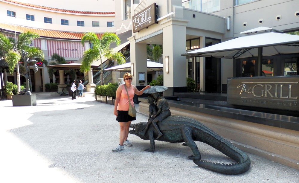 Tamara poseert ook nog even met een alligator die voor de mall staat. Een alligator met twee kinderen erop, tsja….