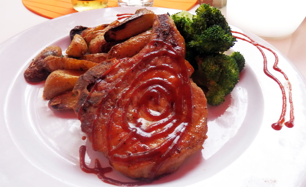 Dan arriveert ons eten. Ik ga voor de spare-ribs en Tamara voor de chopped pork (karbonade)