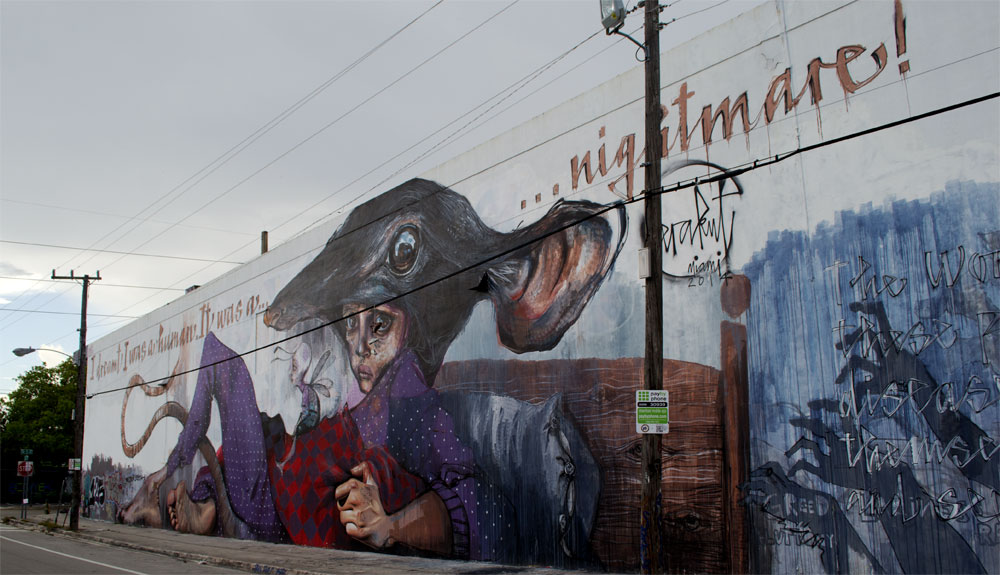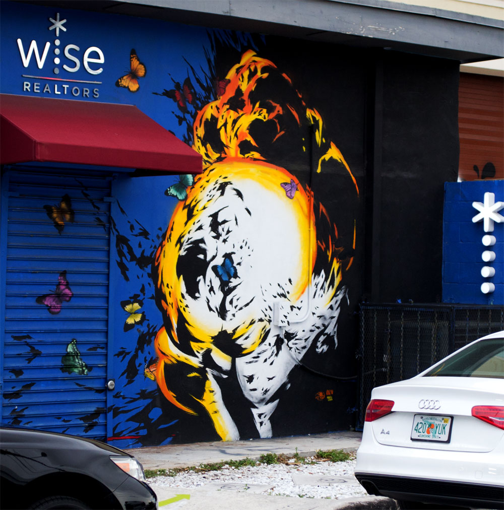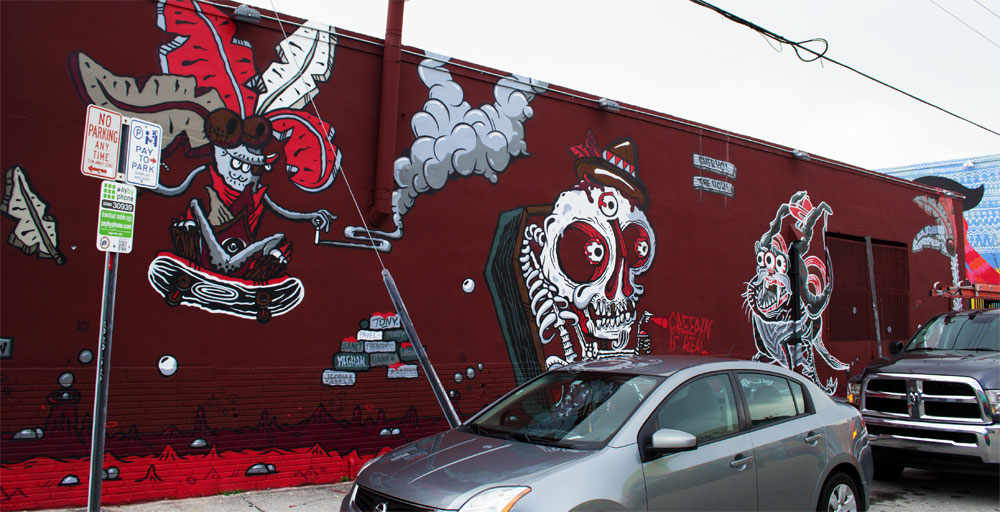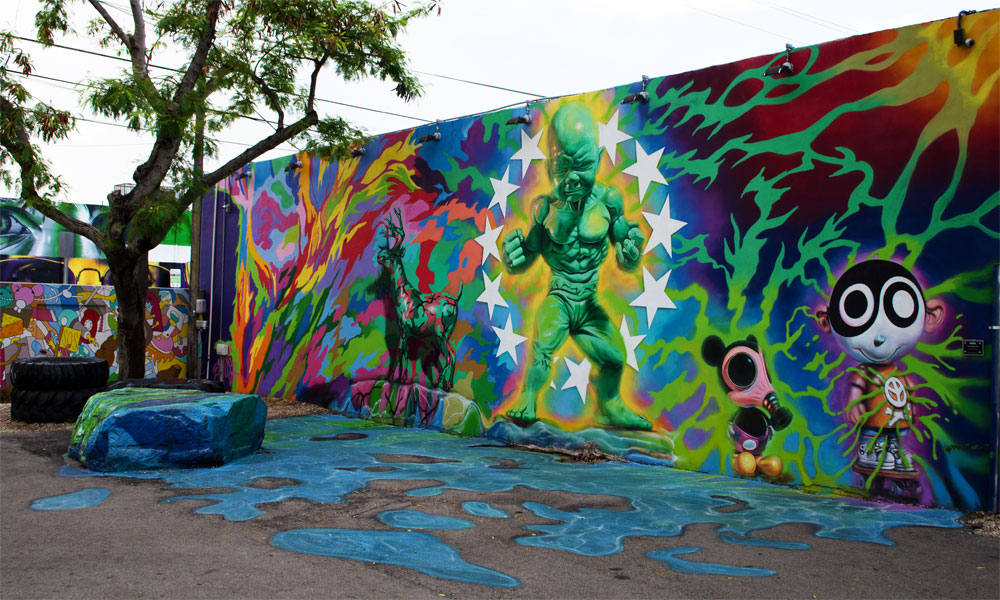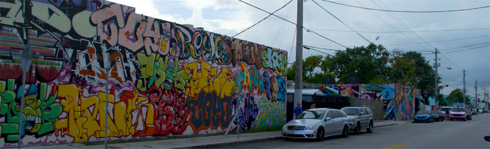 Na zo’n anderhalf uur in het huis en de tuin te hebben rondgelopen gaan we weer richting de uitgang, eigenlijk nog niet wetende wat we nu gaan doen. Het is rond het middaguur, dus lunch staat zoiezo op het lijstje. We besluiten uiteindelijk Wynwood een bezoekje te brengen, dit is een wijk in Miami (ten noorden van downtown) welke bekend staat om zijn kunst. De wijk “Wynwood Art District” barst van de ateliers en musea, maar wij gaan voornamelijk voor “The Wynwood Walls”. Ik kan nu helemaal gaan uitleggen hoe het eruit ziet, maar foto’s zeggen meer dan woorden :-). Je kunt het zien als een wijk vol met graffiti (op hoge kwaliteit) en deels lijkt de wijk verlaten. Het blijkt ook niet de meest veilige wijk te zijn in Miami, maar wij hebben het overleeft :-). Voor zover ik na heb kunnen gaan is het geen groot door de overheid gesubsidieerd project, het is dus maatschappelijk verantwoord gefinancierd met vrijwillige giften/vrijwilligers en met behulp van de markt.