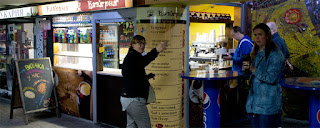 En op bijna elke hoek van de straat (en ook op de rechte stukken) plekken waar je koffie kan kopen. Verse koffie wel te verstaan. Het kan variëren van een roze slak die door heel Kiev staan (ook in het oranje hebben ze al een keer gezien) tot gewone auto’s met espresso apparaat achterin.