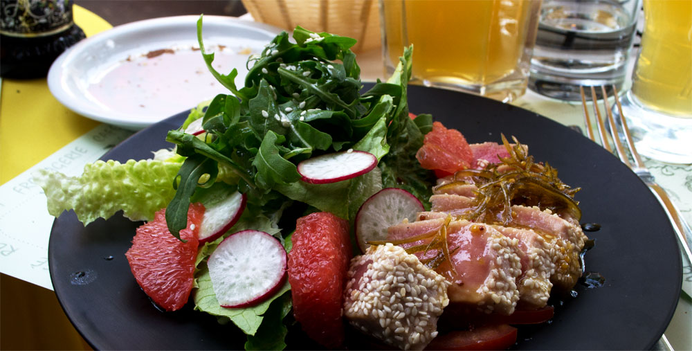 Eenmaal aangekomen bestellen we een lekkere 0,5 liter Hoegaarden (het bierassortiment was ook beperkt) en voor het eten kiezen Tamara en ik de salade nicoise met tonijn en Robert en Vivian gaan voor een salade met eendenborst.
