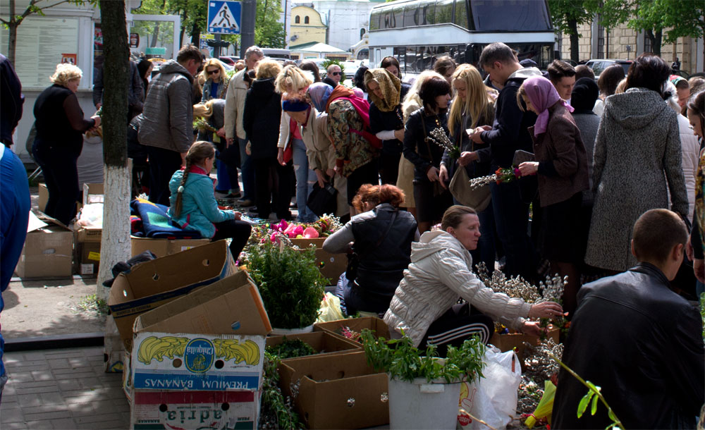 Als we naar buiten lopen komen we recht in de massa mensen aan. Een combinatie van mensen die de bloemetjes komt bezoeken en de mensen die voor de kerk komen. We pakken ook nog een kleine markt mee welke net buiten de uitgang ligt.
