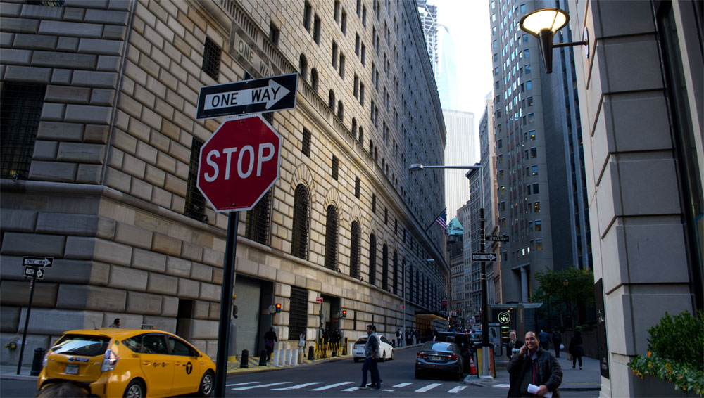Uiteindelijk komen we aan in het financial district, waar we een bezoek zullen brengen aan Wall Street, de Stock Exchange en de Federal Reserve bank of New York. Het hele gebied is grotendeels afgesloten voor regulier verkeer en er lopen best wel wat mannetjes rond met flinke bewapening.