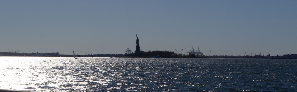 Na een flinke ronde te hebben gelopen (de fietsten staan weer ergens tegen een paal aan) fietsen we weer verder naar het park in het zuiden van Manhattan. Tussendoor maken we nog even een tussenstop bij de Charging Bull waar we echt niet in de rij gaan staan voor een foto. Vanuit Batty Park hebben we een schitterend uitzicht op het water en het vrijheidsbeeld. Helaas met tegenlicht, dus de mogelijkheden voor de foto waren iets beperkt.