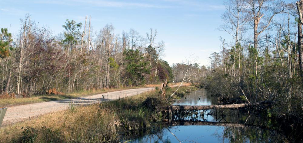 Aangekomen bij het (splinternieuwe) visitorscentre van Aligator River National Wildlife krijgen we een map met een route die we kunnen afleggen met de auto door het park. We rijden vervolgens richting het park wat nog een kwartiertje rijden is.