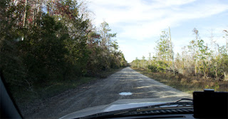 Aan het begin van de route is er naast een schildpad op een boomstronk en een hoop muggen aan beestjes niet veel te zien. De weg zelf is niet verhard, we rijden kilometers lang over gravel met kuilen en we laten enorme stofwolken achter. Maar naast dat de omgeving er wel mooi uitziet, komen we naast een exotische eend en een grote vogel nog niet echt iets echt leuks tegen.