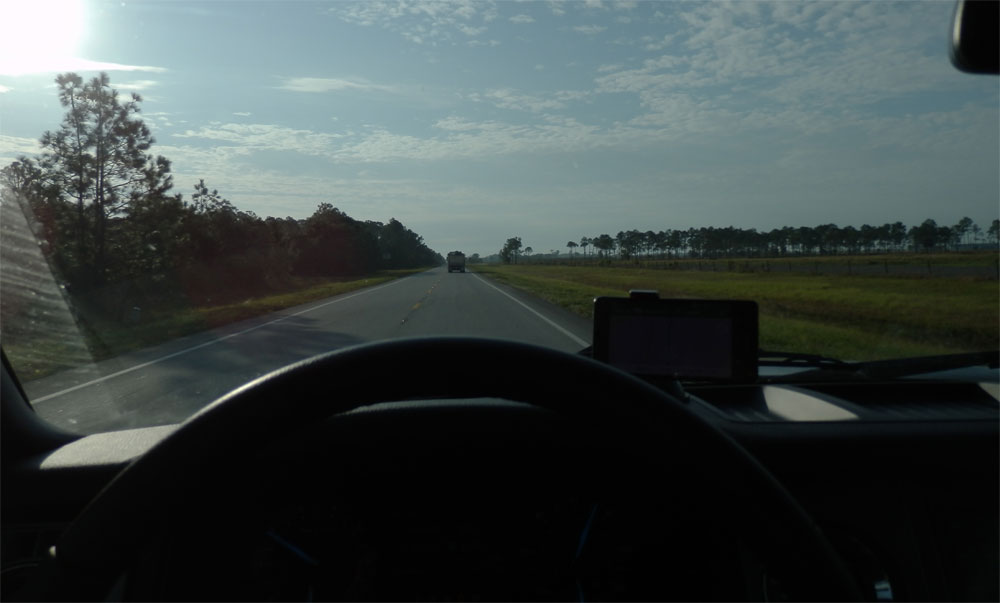 De vorige dag lagen we vroeg op bed, deze ochtend komen we er vroeg uit. Rond 6 uur hebben we onze spullen in de auto zitten en rijden we naar de dichtstbijzijnde Walmart om ons ontbijt te halen. Het is nog vrij vroeg en pas na een tijdje begint het licht te worden, we zijn dan al een aardig eind onderweg en bijna bij Orlando aangekomen waar we langs rijden. Het begint met mist, nadien wat meer licht en eindigt met een lekker fel ochtend-zonnetje.