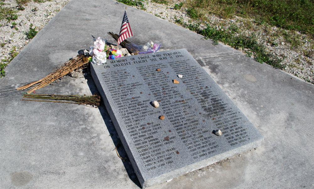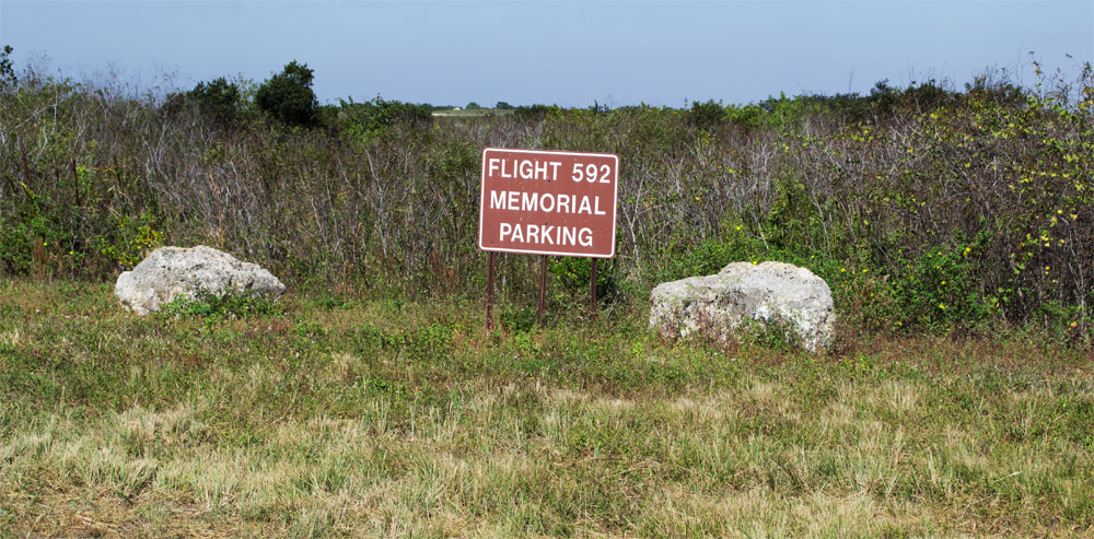 We zijn nu aan het einde van de route gekomen, een bijzonder mooie route met een aantal leuke dieren. Het is een lange route, maar zeer zeker de moeite waard. De volgende stop ligt op zo’n 15 minuten rijden, een memorial van ValuJet Flight 592, een vliegtuig dat in 1996 is neergestort in de Everglades. Het is even goed opletten, het memorial staat langs de hoofdweg, je rijdt er echter zo voorbij als je niet oplet. We parkeren de auto voor de parkeerplaats bij het memorial voor een korte tussenstop. De parkeerplaatsten zelf is gewoon hoog gras, deze worden volgens mij niet veel gebruikt.