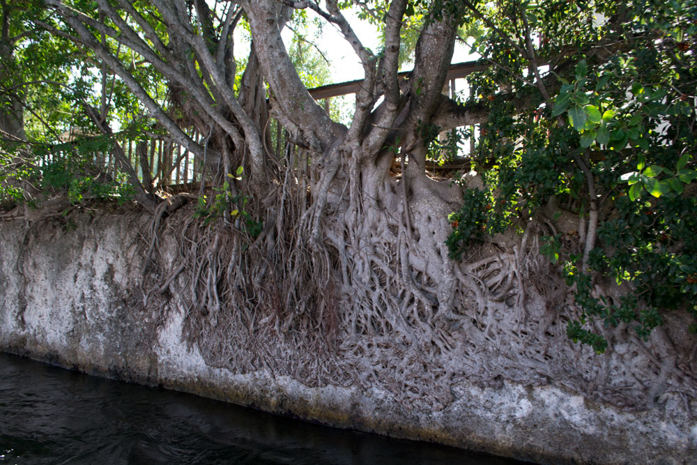 Als de kapitein en gids is gearriveerd stappen we met in totaal 6 man in de boot en beginnen aan de tocht. De eerste stop is in een kanaal waar duidelijk fossielen te zien waren (helaas is het op de foto wat minder duidelijk). De ondergrond van Miami en de Keys zijn grotendeels deze rotsen. Heel erg bijzonder om zo te zien. Er liggen overigens ook leuke huisjes aan het kanaal.