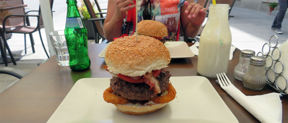 Het is inmiddels lunch tijd, maar om een geschikt terrasje te vinden lukt ons niet echt snel. Uiteindelijk vinden we een hamburger tentje en nemen de gok om te gaan zitten. Nou, dat viel zeker niet tegen!