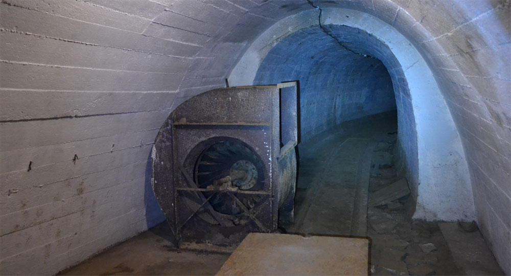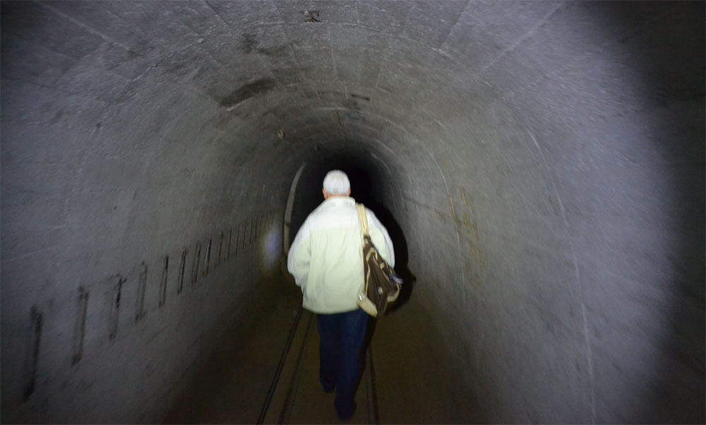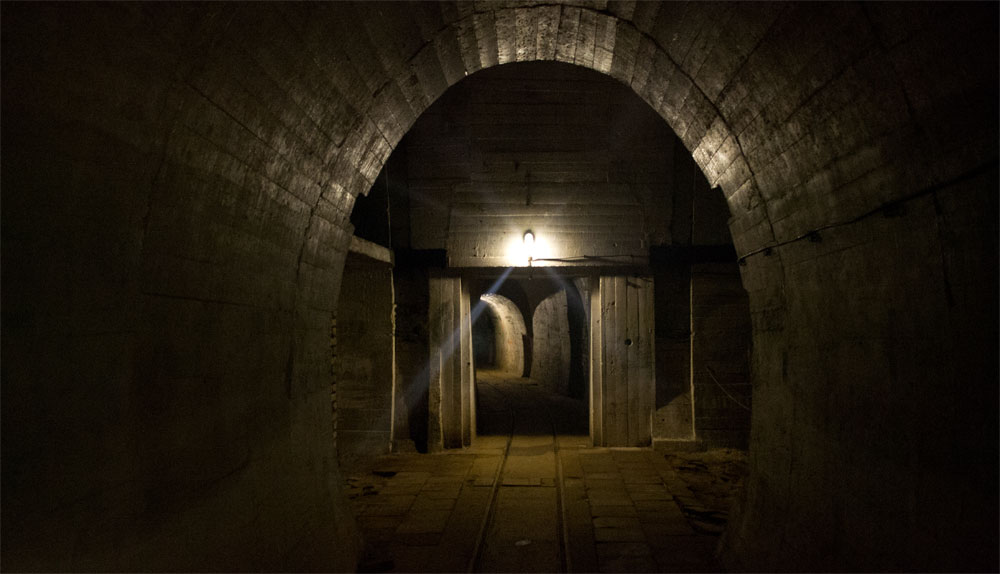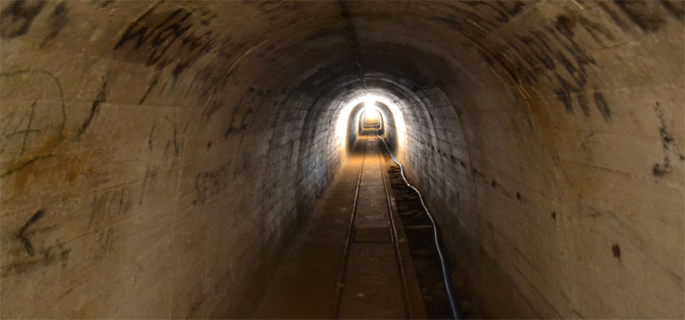 Aangekomen bij de hoofdgang is deze een heel stuk hoger. In het verleden waren deze gangen vaak twee verdiepingen, iets wat nu in de huidige situatie niet meer het geval is. We zien een oud treintje staan in de hoofdgang, dit is echter niet de oude trein die gebruikt werd toen het gangenstelsel nog gebruikt werd door de Duitsers.