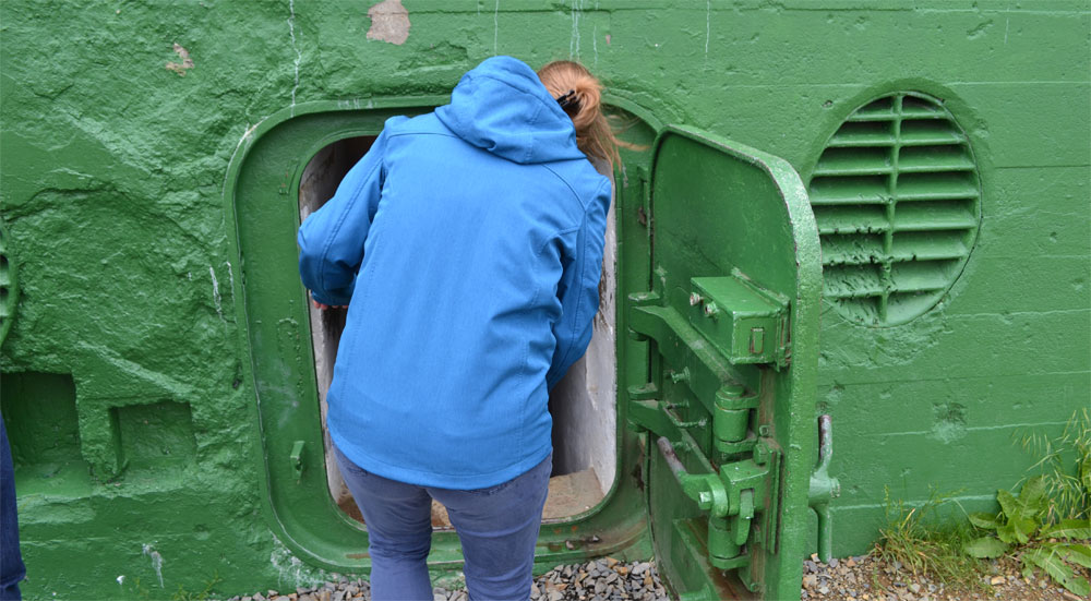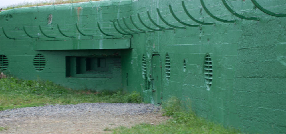 Klaar met deze uitleg is het tijd om de eerste bunker in te gaan. Dit ligt ongeveer op 400 meter van het gebouw af, en het is eenvoudig lopen over een landweggetje. Bovenaan de bunker zijn een aantal bulten te zien waar grote automatische machinegeweren opgesteld stonden. Hierop zijn ook inslagen te zien (dit waren testen welke uitgevoerd waren door ‘ik geloof’ de Russen). Het zijn twee verschillende fabrikanten geweest waarbij de ene geen enkele doorslag heeft gehad, de andere had twee penetraties van inslagen. Als je de inslagen ziet lijkt het alsof zo’n ding van klei is gemaakt, geloof mij, die dingen zijn van massief staal.