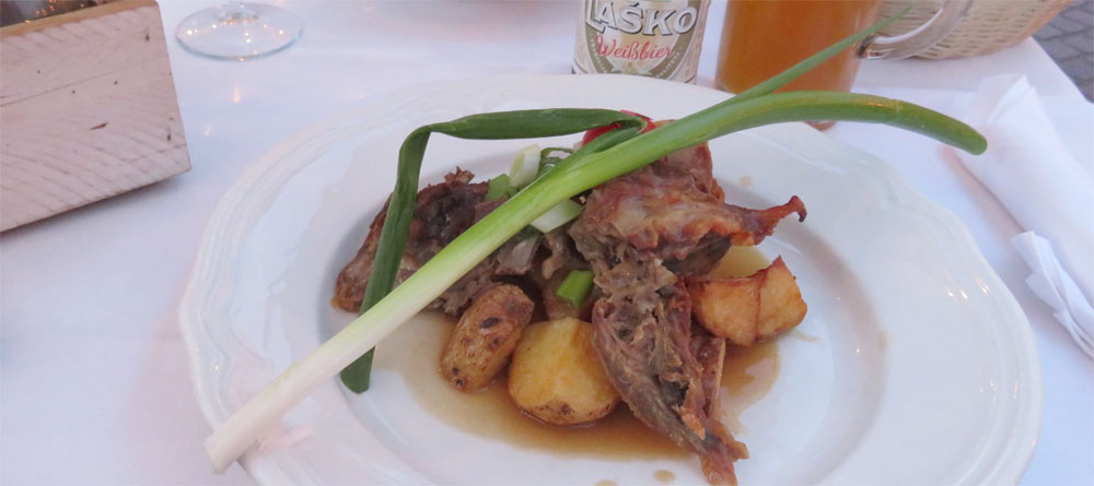 Het eten kwam verdacht snel na onze bestelling, echt binnen vijf minuten stonden onze borden voor onze neuzen. Hmmmmmm…. Tsja, toen we aan het voedsel begonnen merkte we al snel dat dit van kwaliteit “buffetvorm” was. Het eten ligt daar waarschijnlijk gewoon klaar in warmhoudbakken. Het eten valt jammer genoeg tegen, en dit was niet echt een goedkoop tentje. Toen aan mij gevraagd werd of alles naar wens was gaf ik uiteraard aan dat mijn verwachtingen een stuk hoger lagen dan hetgeen wat was opgediend. De reactie van het personeel gaf mij het gevoel dat hij deze reactie vaker krijgt. Mocht je naar LJubljana gaan, kijk goed naar bovenstaande foto als je op zoek gaat naar een eet-tentje, en sla deze over ;-).