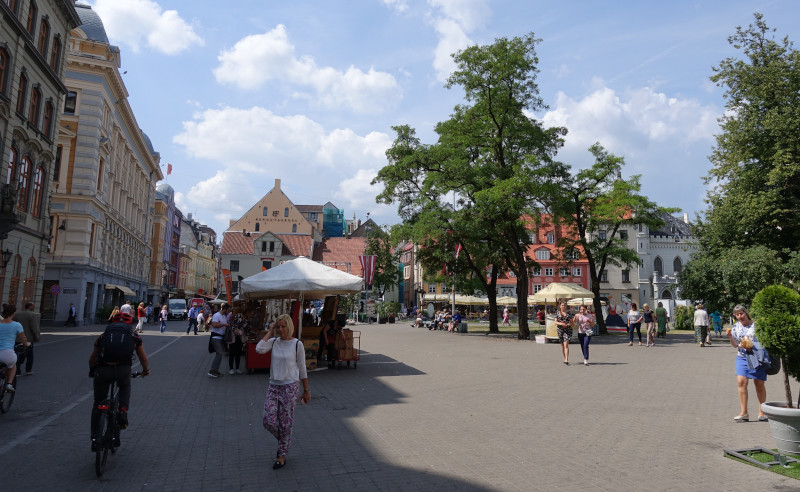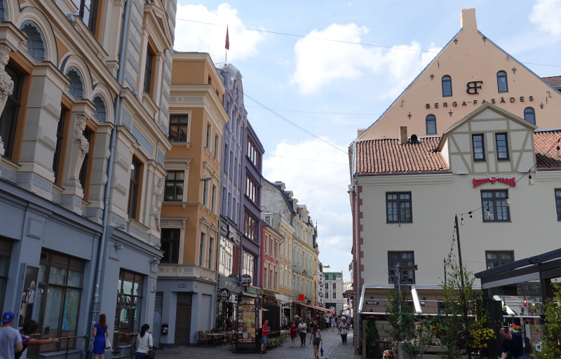 Als we klaar zijn met de tour lopen we richting het oude centrum van Riga. Het oude centrum behoort tot Unesco werelderfgoed. Het zonnetje schijnt nog steeds, en er staat een lekker briesje. Nog helemaal niets te bekennen van de regen welke ze hadden verwacht. Gelukkig! Het oude centrum is een schitterend centrum om te zien. Veel oude gebouwen, en veel verschillende kleuren.