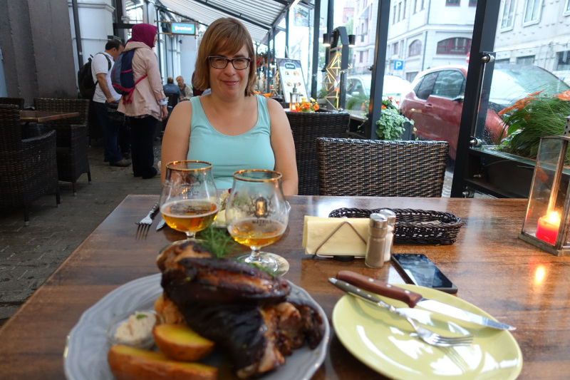 Rond een uur of 5 begint het flinkt te regenen met lichte ontweer. Voordat we het een beetje acceptabel vinden om met een paraplu te lopen is het rond een uur of 6. We lopen weer richting het centrum om een leuk plekje te zoeken om te eten. We kiezen uiteindelijk voor een restaurantje met een “lokale” keuken. Tamara gaat voor een stuk koe, ik pak een stuk poot van een varken. Uiteraard met een lekker biertje erbij :-).