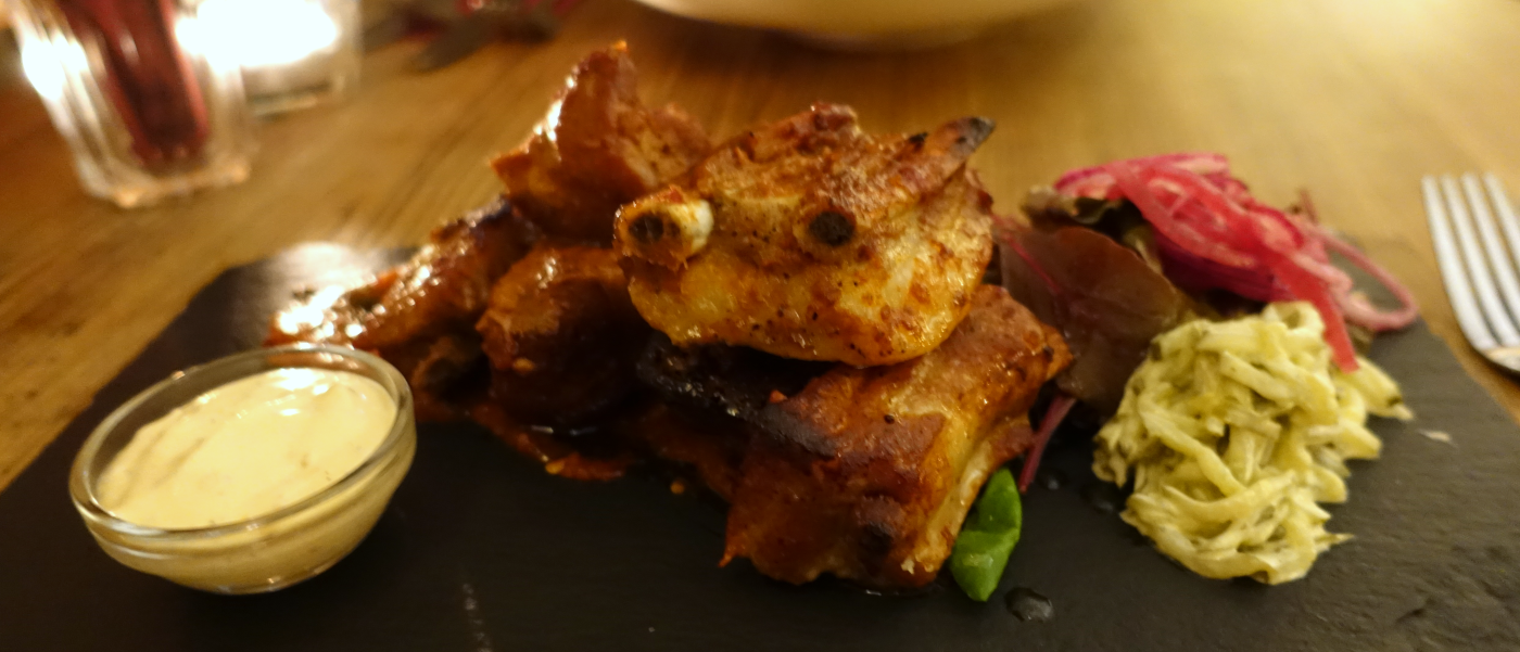 Dit keer besluiten we niet om enkel voor het hoofdgerecht te gaan, maar ook voor een voorgerecht. We beginnen met een biersalade voor Tamara en ribs gegaard in bier voor mij.