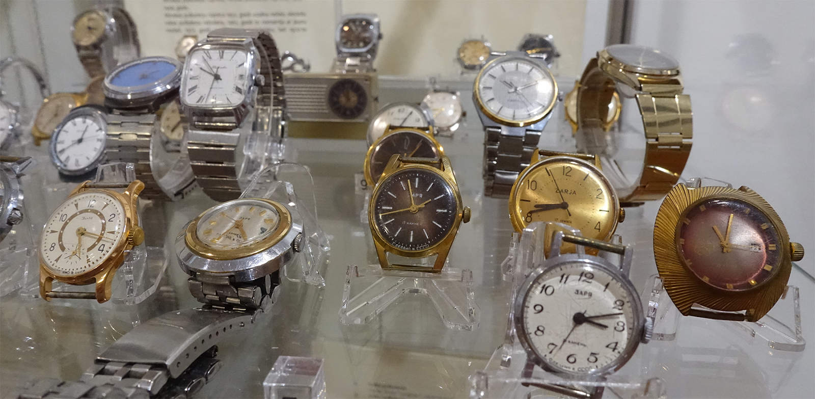 Binnengekomen kopen we twee kaartjes van 5 euro per stuk en beginnen we aan de route door het grote gebouw. Te beginnen bij een tijdelijke expeditie van klokken.